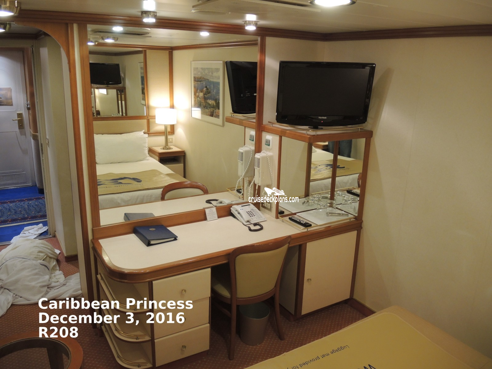 These are some actual stateroom pictures of cabin R208 on the Caribbean Princess. Click on images below for larger image and slide show. The slide show will show the date the picture was uploaded to out website. This date is useful because Caribbean Princess typically will update its cabins every three to five years with new carpeting and decor. We will keep older pictures for you to compare the more recent photos to. The pictures are sorted by the newest ones first. Most of our cabin pictures are contributed by actual cruisers. We pay 50 cents for any that we use. You can upload your cabin photos HERE. Afer you are done looking at these photos and/or the videos below you can click here to select another cabin.