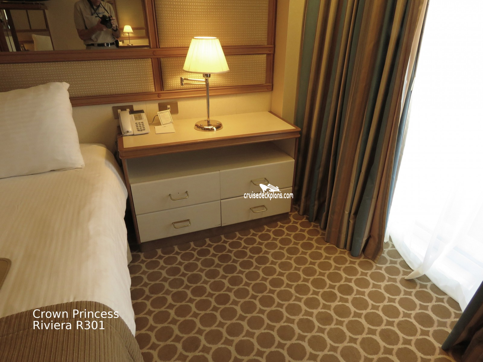 Crown Princess Balcony cabin number R301 ACTUAL videos and/or pictures, floor plans, diagrams and detailed features including a deck image of the actual location on the Crown Princess ship for cabin R301. Cruisedeckplans.com has 72,949 different (staterooms) cabins that have actual cabin pictures and/or cabin videos taken by real cruisers. That is plenty of coverage to provide you with a good sampling of all the different cabins on cruise ships. Take a minute and notice the breadcrumb menu above. This is a quick easy way to navigate our website. You can also use the menu above for menu items specific to the Crown Princess cruise ship.