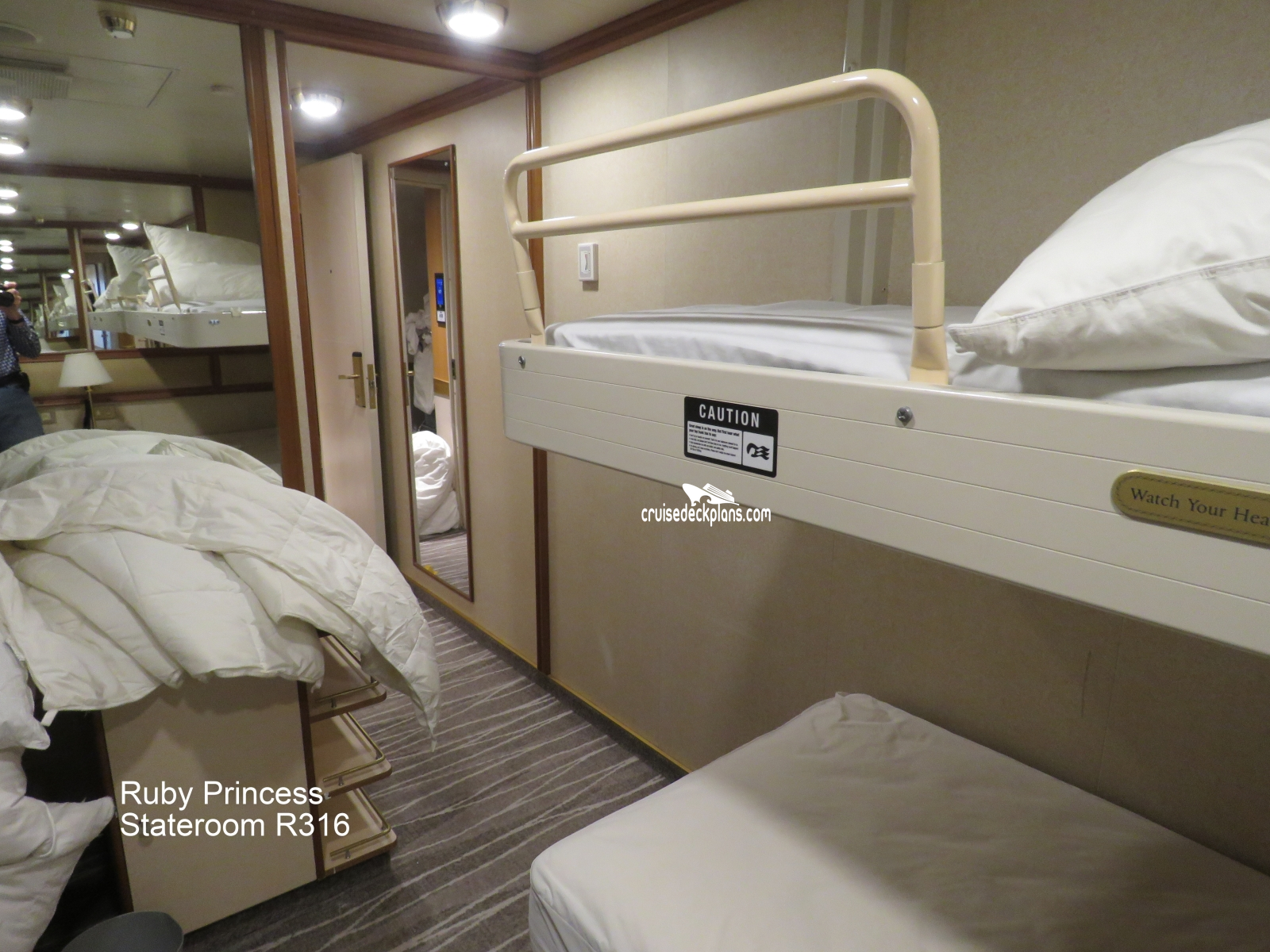 Ruby Princess Interior cabin number R316 ACTUAL videos and/or pictures, floor plans, diagrams and detailed features including a deck image of the actual location on the Ruby Princess ship for cabin R316. Cruisedeckplans.com has 74,709 different (staterooms) cabins that have actual cabin pictures and/or cabin videos taken by real cruisers. That is plenty of coverage to provide you with a good sampling of all the different cabins on cruise ships. Take a minute and notice the breadcrumb menu above. This is a quick easy way to navigate our website. You can also use the menu above for menu items specific to the Ruby Princess cruise ship.