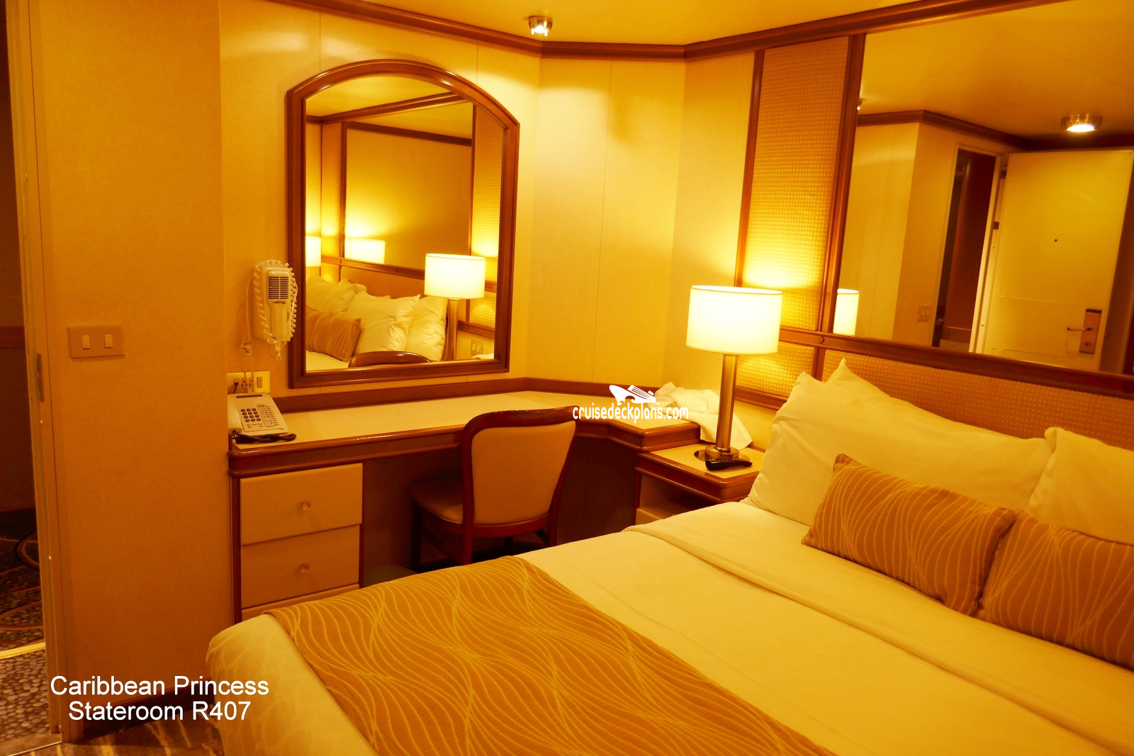 These are some actual stateroom pictures of cabin R407 on the Caribbean Princess. Click on images below for larger image and slide show. The slide show will show the date the picture was uploaded to out website. This date is useful because Caribbean Princess typically will update its cabins every three to five years with new carpeting and decor. We will keep older pictures for you to compare the more recent photos to. The pictures are sorted by the newest ones first. Most of our cabin pictures are contributed by actual cruisers. We pay 50 cents for any that we use. You can upload your cabin photos HERE. Afer you are done looking at these photos and/or the videos below you can click here to select another cabin.