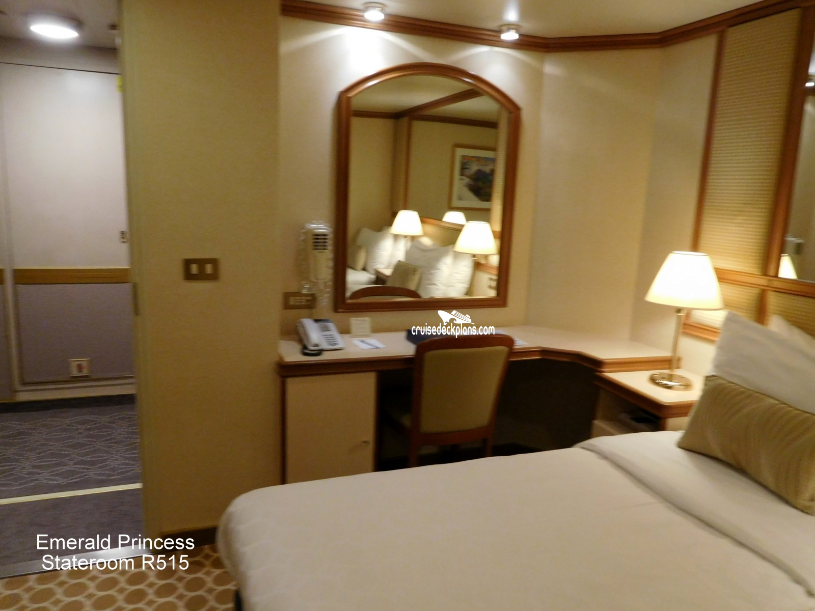These are some actual stateroom pictures of cabin R515 on the Emerald Princess. Click on images below for larger image and slide show. The slide show will show the date the picture was uploaded to out website. This date is useful because Emerald Princess typically will update its cabins every three to five years with new carpeting and decor. We will keep older pictures for you to compare the more recent photos to. The pictures are sorted by the newest ones first. Most of our cabin pictures are contributed by actual cruisers. We pay 50 cents for any that we use. You can upload your cabin photos HERE. Afer you are done looking at these photos and/or the videos below you can click here to select another cabin.