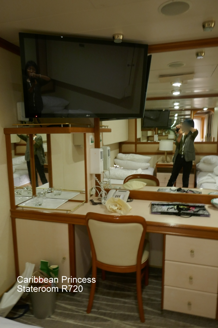 These are some actual stateroom pictures of cabin R720 on the Caribbean Princess. Click on images below for larger image and slide show. The slide show will show the date the picture was uploaded to out website. This date is useful because Caribbean Princess typically will update its cabins every three to five years with new carpeting and decor. We will keep older pictures for you to compare the more recent photos to. The pictures are sorted by the newest ones first. Most of our cabin pictures are contributed by actual cruisers. We pay 50 cents for any that we use. You can upload your cabin photos HERE. Afer you are done looking at these photos and/or the videos below you can click here to select another cabin.