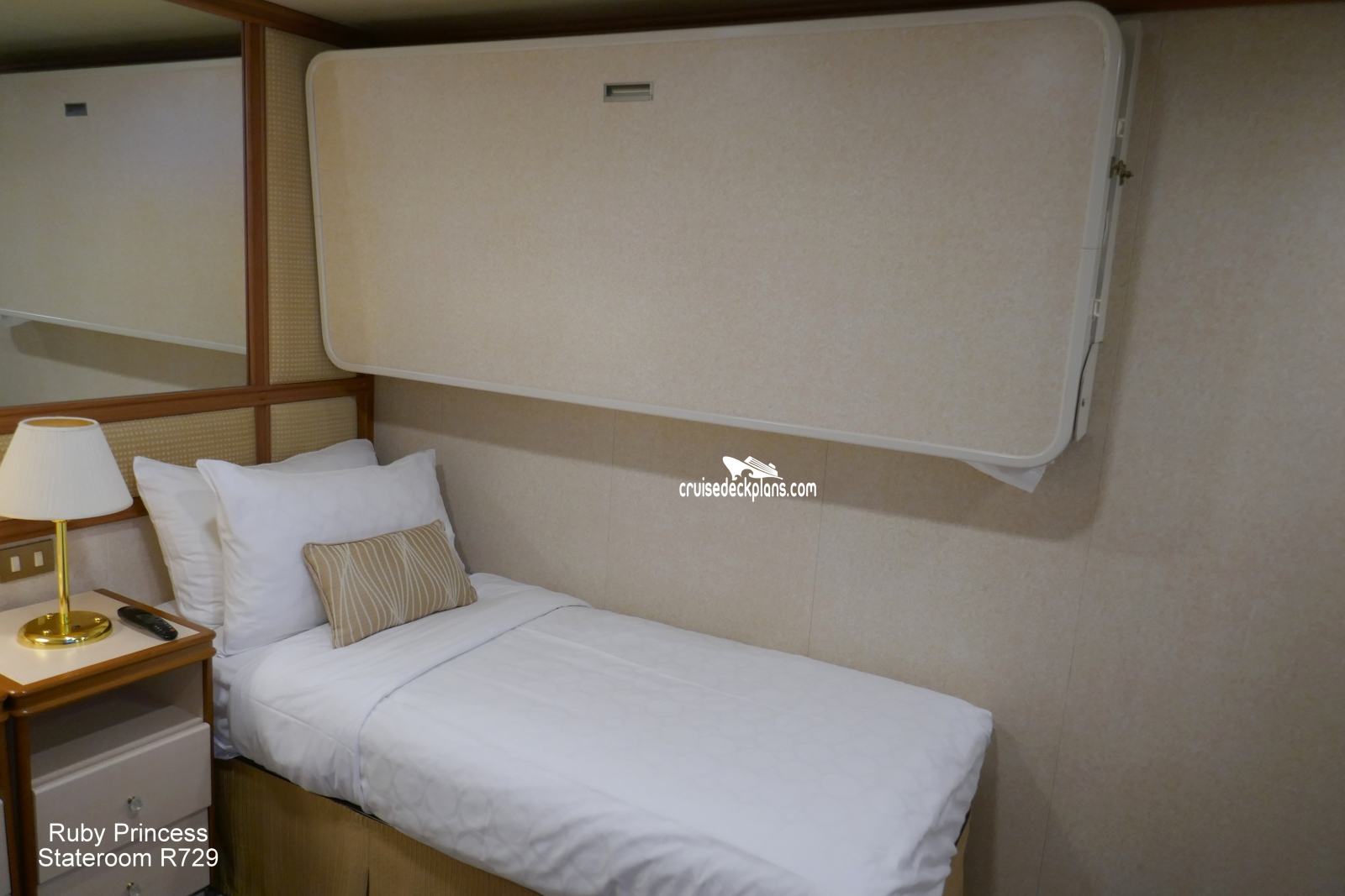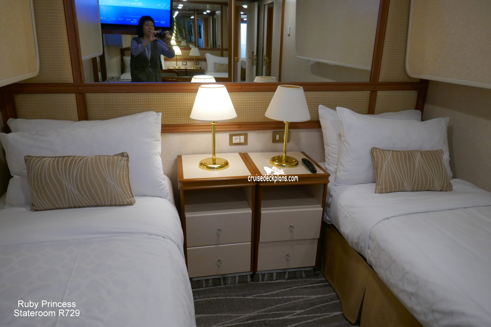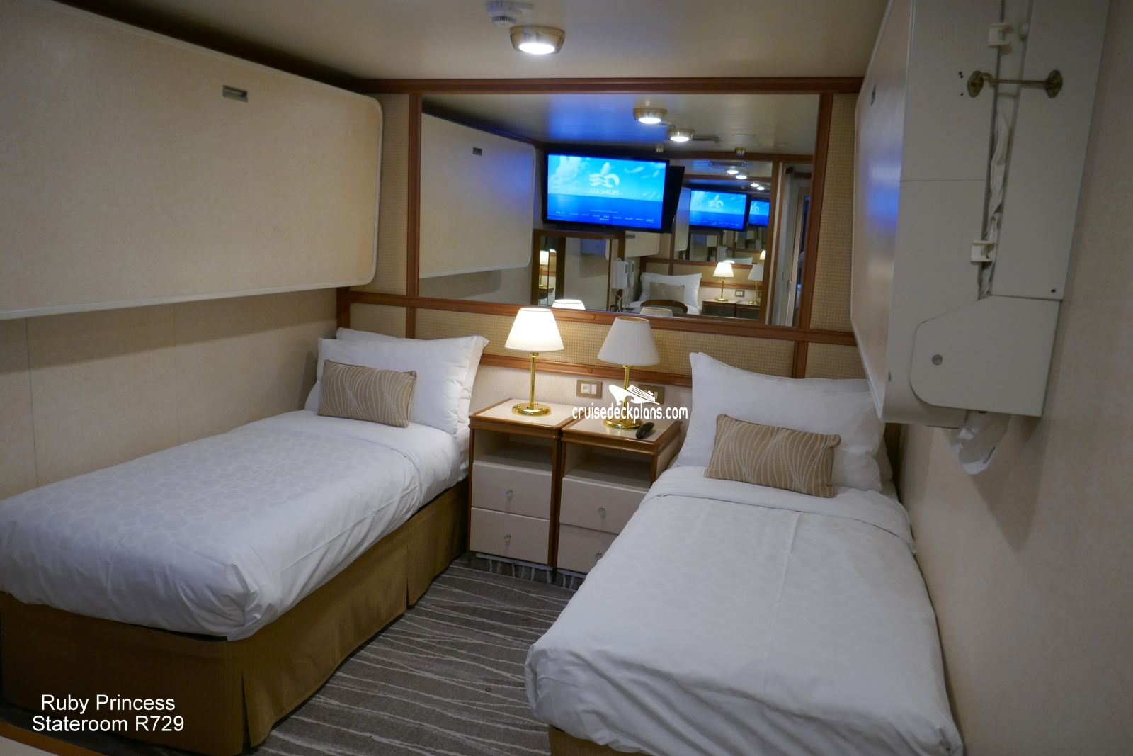 Ruby Princess Interior cabin number R729 ACTUAL videos and/or pictures, floor plans, diagrams and detailed features including a deck image of the actual location on the Ruby Princess ship for cabin R729. Cruisedeckplans.com has 74,366 different (staterooms) cabins that have actual cabin pictures and/or cabin videos taken by real cruisers. That is plenty of coverage to provide you with a good sampling of all the different cabins on cruise ships. Take a minute and notice the breadcrumb menu above. This is a quick easy way to navigate our website. You can also use the menu above for menu items specific to the Ruby Princess cruise ship.