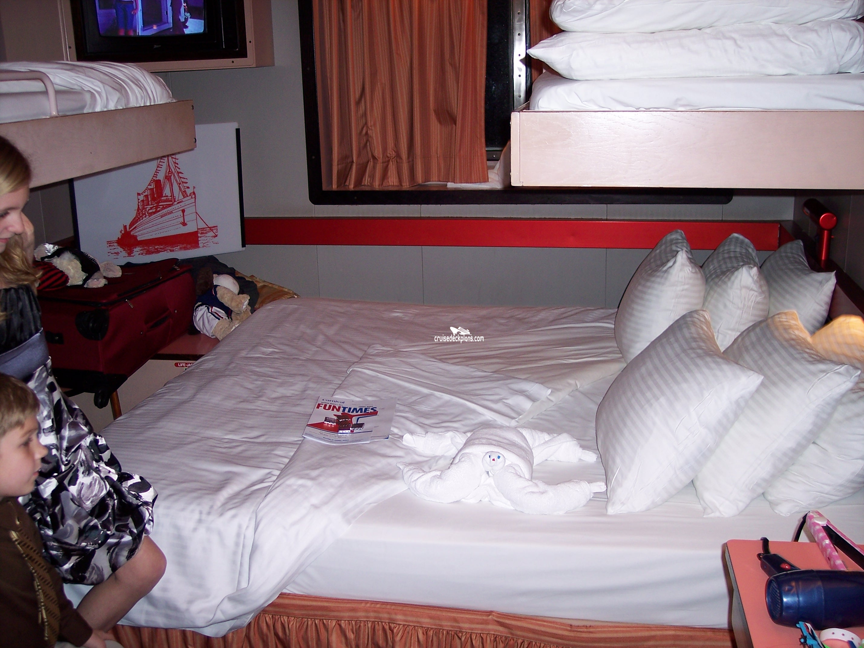 These are some actual stateroom pictures of cabin U193 on the Carnival Elation. Click on images below for larger image and slide show. The slide show will show the date the picture was uploaded to out website. This date is useful because Carnival Elation typically will update its cabins every three to five years with new carpeting and decor. We will keep older pictures for you to compare the more recent photos to. The pictures are sorted by the newest ones first. Most of our cabin pictures are contributed by actual cruisers. We pay 50 cents for any that we use. You can upload your cabin photos HERE. Afer you are done looking at these photos and/or the videos below you can click here to select another cabin.