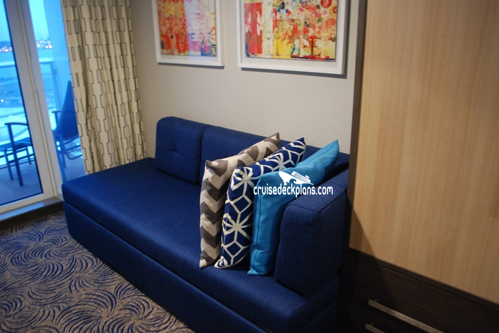 2C (was D1) balconies range from 55 to 119 square feet. Cabins 6254, 6258, 6654, 6658, 7254, 7258, 7654, 7658 have a chair instead of sofa and are 177 square feet with 82 square feet balconies. Category 1E and 2E (was DO) and 2F (was SB) is obstructed by view of top of lifeboat. Forward category 2E (was DO) on deck 7 and deck 8 is obstructed by steel frame that forms porthole opening. Some cabins have sofa near the balcony and others have bed near the balcony.