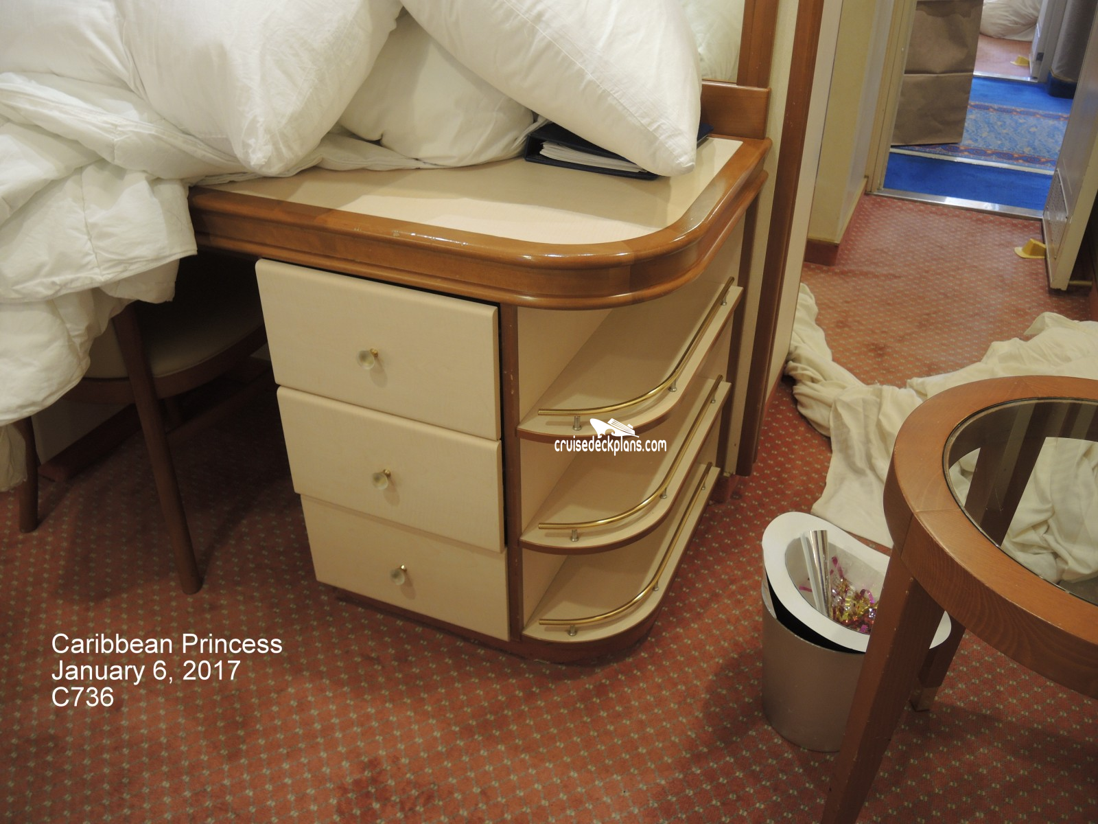 These are some actual stateroom pictures of cabin C736 on the Caribbean Princess. Click on images below for larger image and slide show. The slide show will show the date the picture was uploaded to out website. This date is useful because Caribbean Princess typically will update its cabins every three to five years with new carpeting and decor. We will keep older pictures for you to compare the more recent photos to. The pictures are sorted by the newest ones first. Most of our cabin pictures are contributed by actual cruisers. We pay 50 cents for any that we use. You can upload your cabin photos HERE. Afer you are done looking at these photos and/or the videos below you can click here to select another cabin.