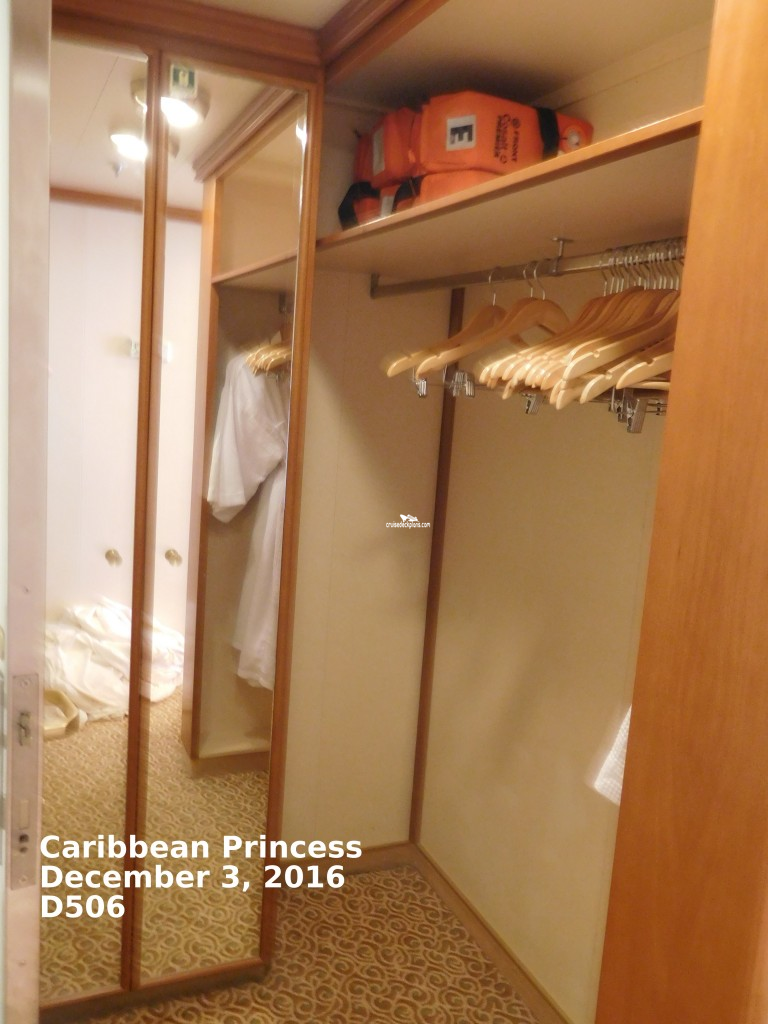 These are some actual stateroom pictures of cabin D506 on the Caribbean Princess. Click on images below for larger image and slide show. The slide show will show the date the picture was uploaded to out website. This date is useful because Caribbean Princess typically will update its cabins every three to five years with new carpeting and decor. We will keep older pictures for you to compare the more recent photos to. The pictures are sorted by the newest ones first. Most of our cabin pictures are contributed by actual cruisers. We pay 50 cents for any that we use. You can upload your cabin photos HERE. Afer you are done looking at these photos and/or the videos below you can click here to select another cabin.