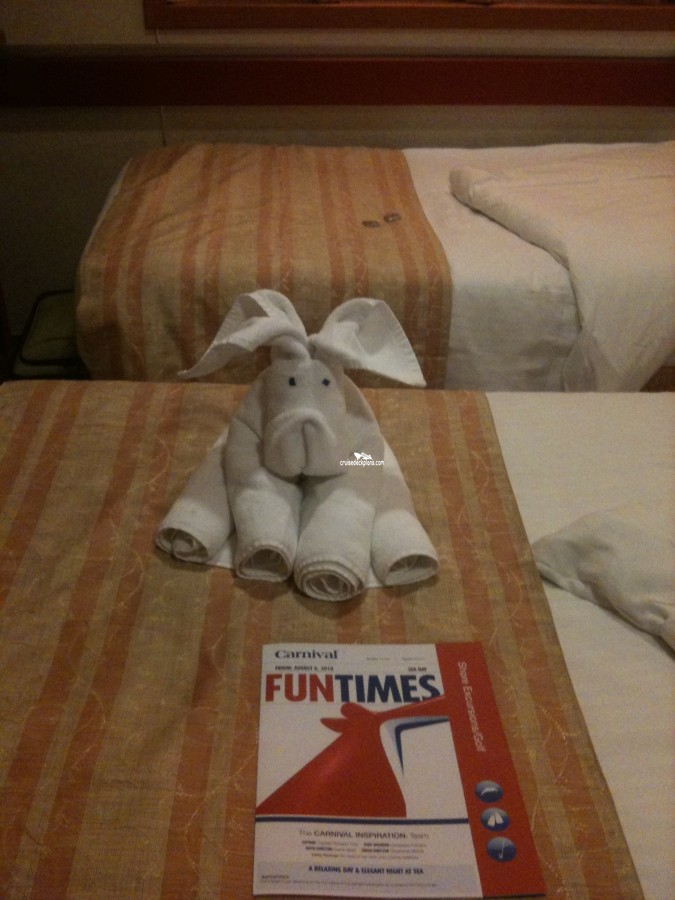These are some actual stateroom pictures of cabin U5 on the Carnival Inspiration. Click on images below for larger image and slide show. The slide show will show the date the picture was uploaded to out website. This date is useful because Carnival Inspiration typically will update its cabins every three to five years with new carpeting and decor. We will keep older pictures for you to compare the more recent photos to. The pictures are sorted by the newest ones first. Most of our cabin pictures are contributed by actual cruisers. We pay 50 cents for any that we use. You can upload your cabin photos HERE. Afer you are done looking at these photos and/or the videos below you can click here to select another cabin.