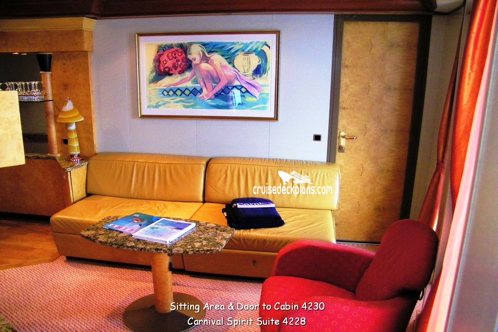 Carnival Spirit Vista Suite cabin number 4228 ACTUAL videos and/or pictures, floor plans, diagrams and detailed features including a deck image of the actual location on the Carnival Spirit ship for cabin 4228. Cruisedeckplans.com has 65,411 different (staterooms) cabins that have actual cabin pictures and/or cabin videos taken by real cruisers. That is plenty of coverage to provide you with a good sampling of all the different cabins on cruise ships. Take a minute and notice the breadcrumb menu above. This is a quick easy way to navigate our website. You can also use the menu above for menu items specific to the Carnival Spirit cruise ship.
