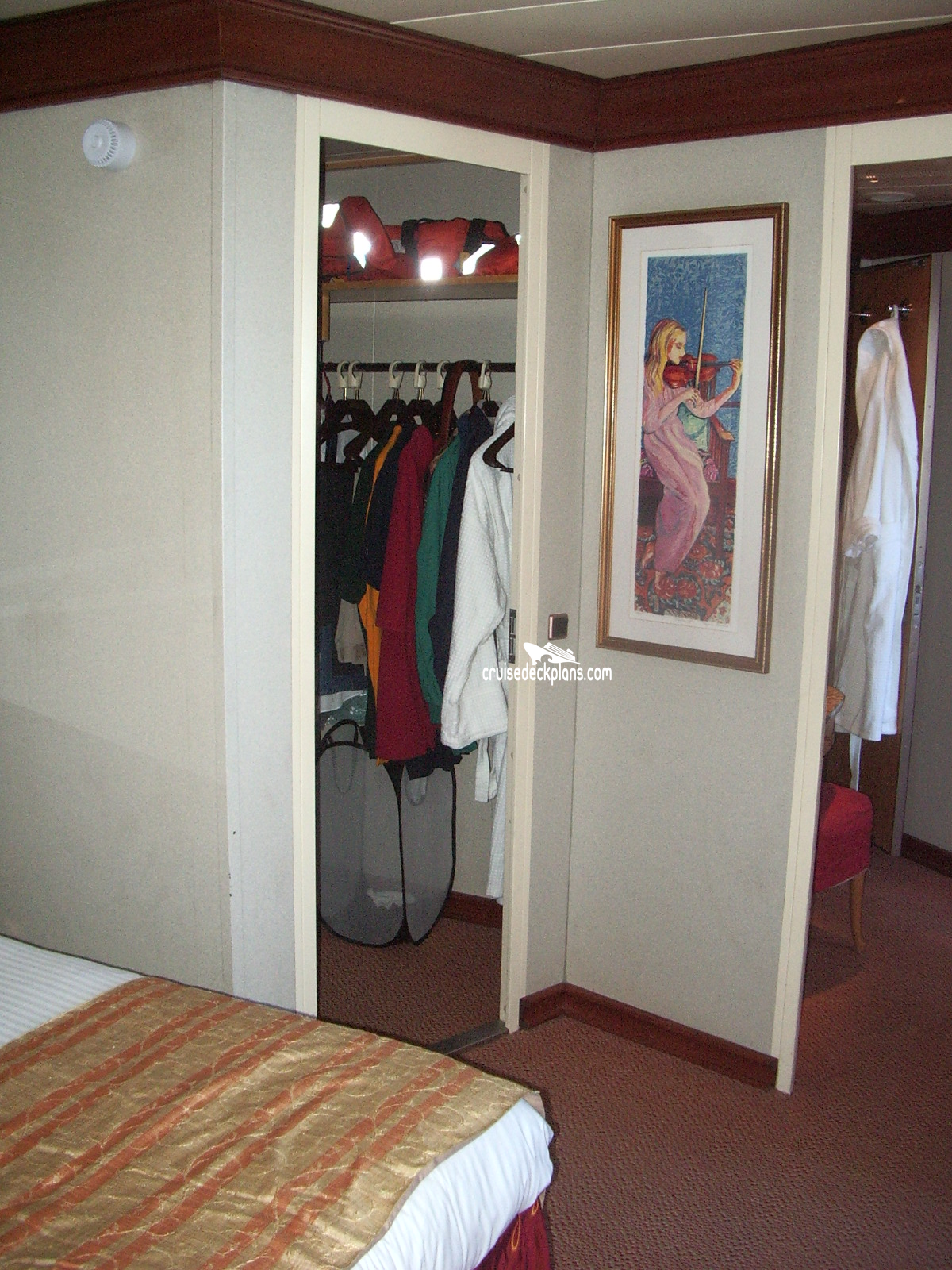 This cabin features a wrap around balcony. Staterooms 4228, 4237, 6260, 6329, 7298, 7347 ,8268 and 8273 feature a separate bedroom from sitting area with another LCD television and walk-in dressing area with vanity table and chair.