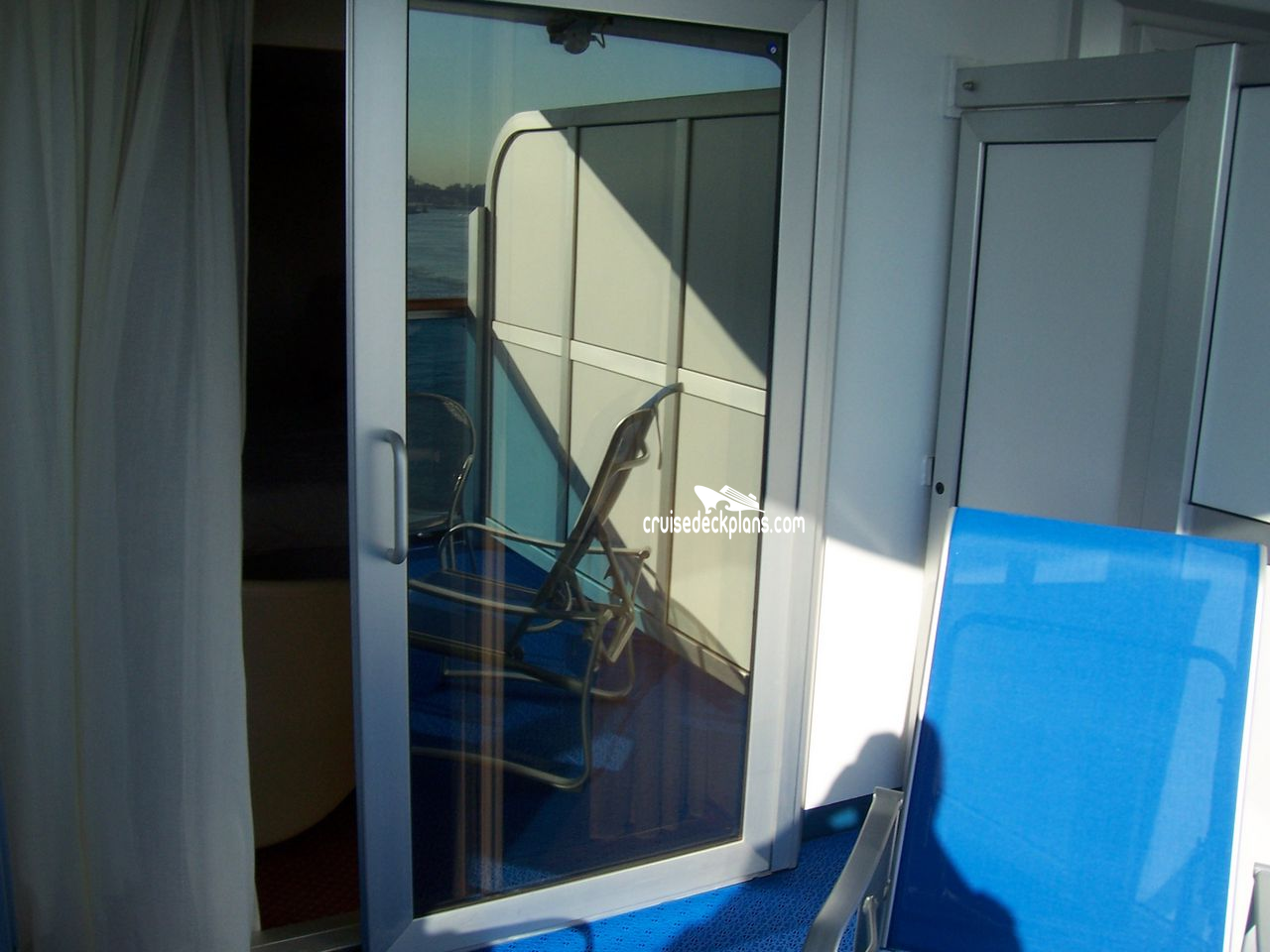 Balcony size ranges from 46 to 89 square feet. Cabin A747 balcony extends out in a triangle shape. Caribe deck balconies are sized 9 ft. wide x 9 ft. deep and have ceiling overhang/balcony cover over the first 5 ft.
