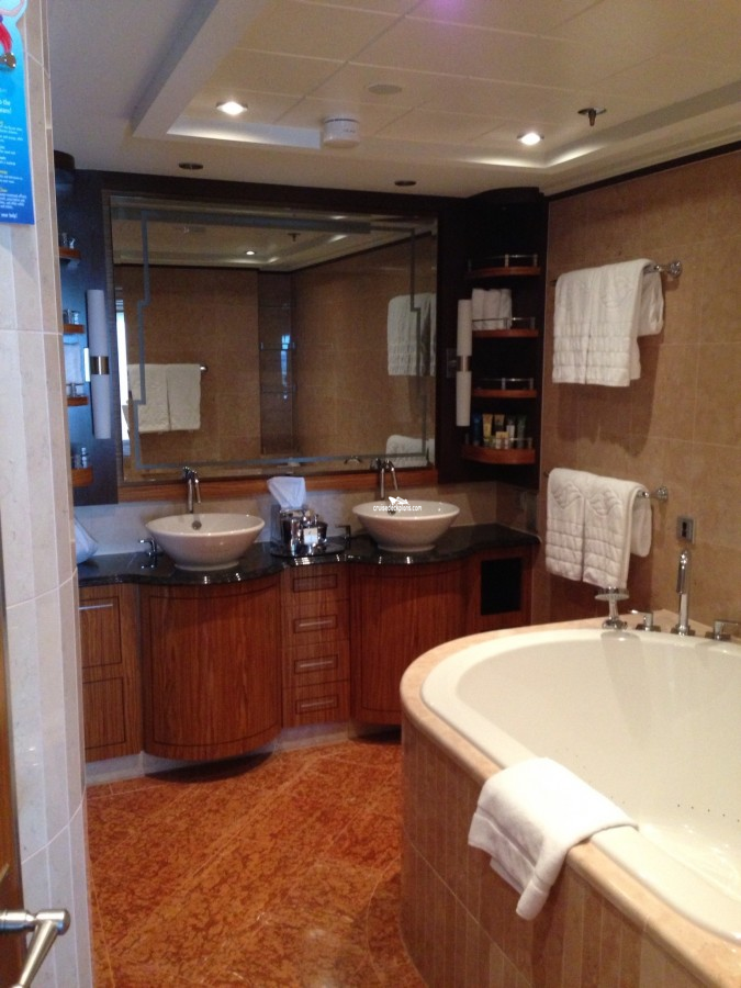 Concierge Service / Priority Check In / Priority Tender Boarding / Dining in the Stateroom / Exclusive Lounge / Priority Dining Reservations / Exclusive Outdoor Lounge / Thick Cotton Robes / Pillow Menu / Sealy Posturepedic Euro-top mattress / Frette 100% Egyptian cotton linens / 2 LCD 42 inch HD flat screen Tvs / Ipod docking station / Enhanced line of H20 Plus spa products / Media library / Pre-arrival concierge services /