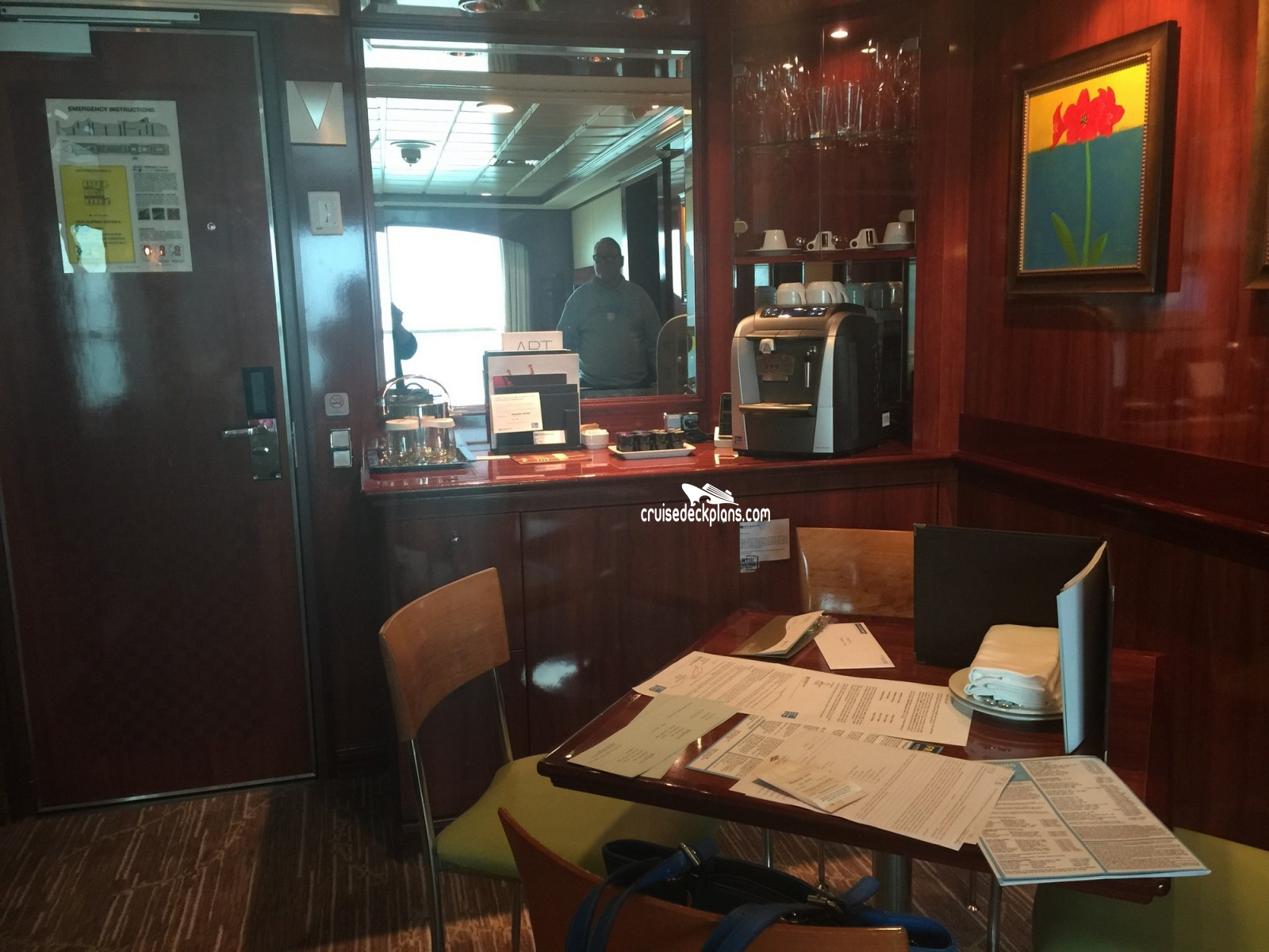 Butler Service / Concierge Service / Priority Check In / Priority Debarkation / Priority Tender Boarding / Dining in the Stateroom / Welcome Champagne / Exclusive Lounge / Exclusive Pool / Exclusive Outdoor Lounge / Thick Cotton Robes / Pillow Menu / Espresso & Cappuccino machine / Special suite menus / Bliss collection pillow-top mattress / Treats delivered to door every night / Courtyard valet / Escort to suite /