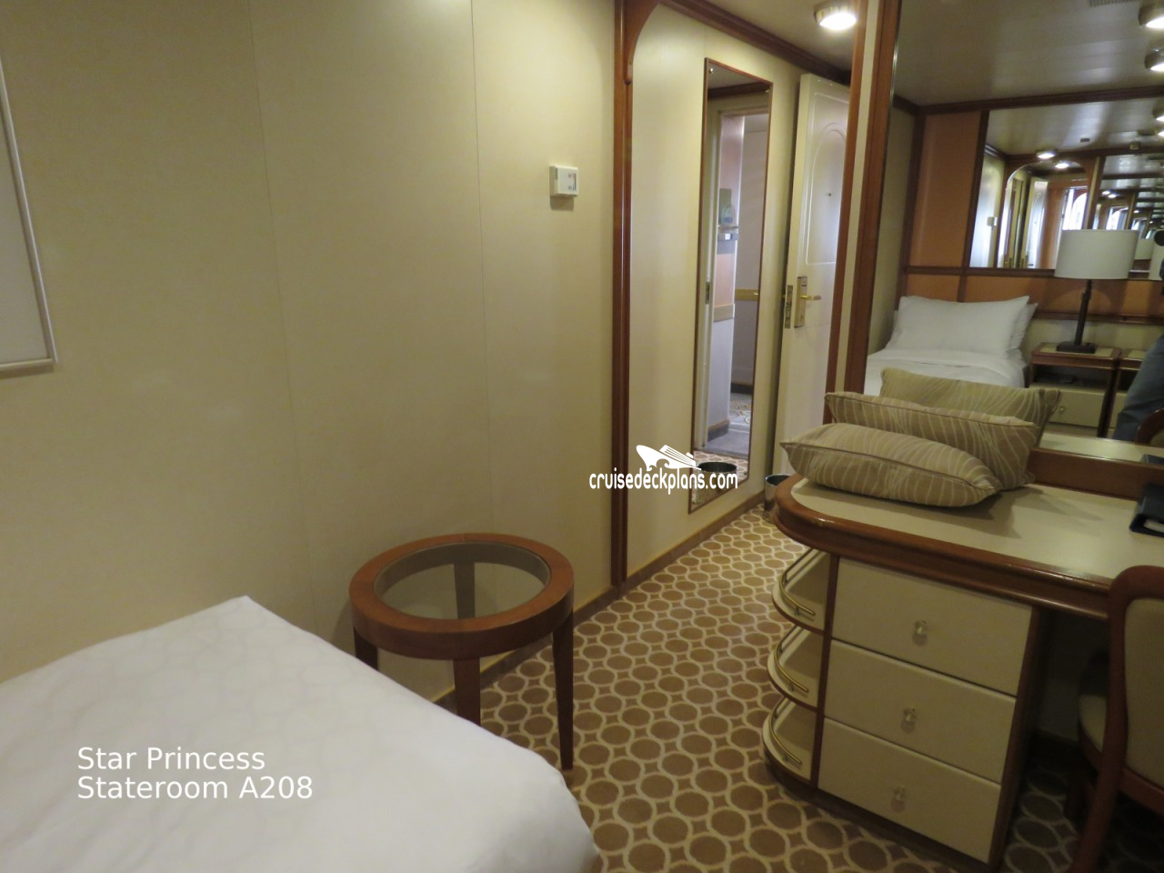 Star Princess II Interior cabin number A208 ACTUAL videos and/or pictures, floor plans, diagrams and detailed features including a deck image of the actual location on the Star Princess II ship for cabin A208. Cruisedeckplans.com has 73,882 different (staterooms) cabins that have actual cabin pictures and/or cabin videos taken by real cruisers. That is plenty of coverage to provide you with a good sampling of all the different cabins on cruise ships. Take a minute and notice the breadcrumb menu above. This is a quick easy way to navigate our website. You can also use the menu above for menu items specific to the Star Princess II cruise ship.